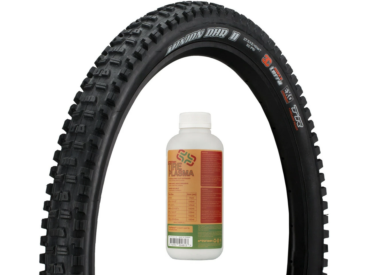 Le pneu souple Maxxis Minion DHR II 3C MaxxTerra EXO WT TR 27,5″ en set avec le fluide d’étanchéité e*thirteen Tire Plasma